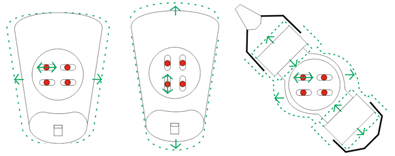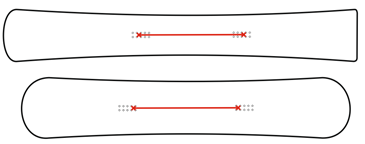 W przypadku wiązań miękkich najczęściej mamy możliwość przesunięcia położenia śrub na talerzykach. Z reguły wykorzystuje się je tak jak na środkowym rysunku do ustawienia wiązania w poprzek deski, czyli cofnięcie buta/wiązania jeśli wystaje poza krawędź. Często można także cofnąć łyżkę, jednak bardzo rzadko mamy możliwość wykorzystania tej regulacji do przesunięcia wiązania w przód lub tył deski. A te 2 cm na wiązaniu, mogą zrobić różnicę. W przypadku wiązań twardych prawie zawsze możemy na talerzyku przesuwać wiązanie w przód lub tył deski gdyż położenie (wysunięcie) buta reguluje się osobną śrubą która przesuwa przód i tył wiązania w płaszczyźnie podłużnej.