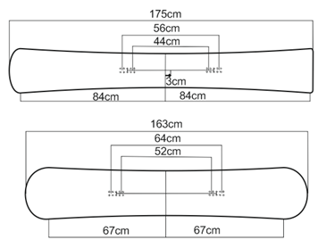 Weźmy dwie deski na dużą osobę o wzroście powiedzmy 185cm. Wybieramy średniej długości deskę alpejską 175cm i długą miękką 163cm.