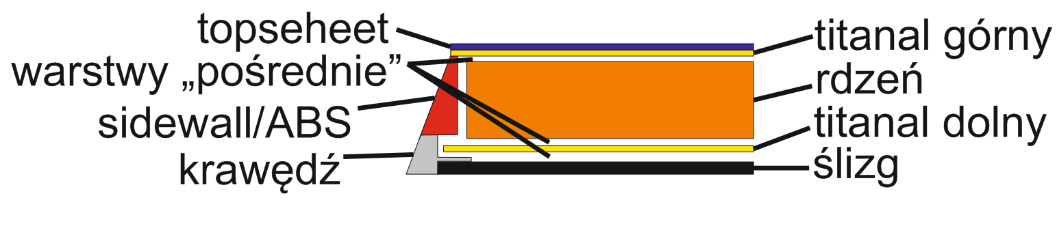 Czyli idąc od spodu: ślizg, titanal, rdzeń, titanal oraz ewentualny topsheet. Plus warstwy pomiędzy titanalem a pozostałymi elementami deski, których wykonanie oraz użyte materiały zależą od filozofii i możliwości producenta.