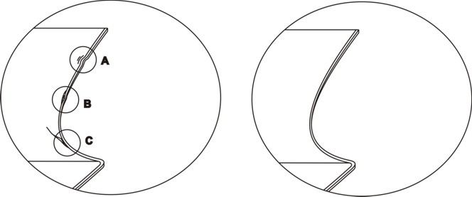 Najważniejszą rzeczą są krawędzie: patrząc na nie wzdłuż deski od strony ślizgu ich krzywizna musi być płynna bez zawirowań/zniekształceń. Oznaczają one że deska była "bita" a nie jest to samochód który można "wyklepać". W przypadku wyrwania krawędzi odchodzi ona na zewnątrz, w przypadku uderzenia może "wejść pod ślizg". Takie uderzenie (np. o bramkę na wyciągu) na dziobie w miejscu gdzie krawędź nie ma styku ze śniegiem to rzecz normalna i nic się w tym przypadku nie dzieje, ale każde nie normalne zakrzywienie krawędzi (w obu płaszczyznach) w miejscy styku ze śniegiem oznacza że deska ma już swoją historię i może być uszkodzona. .