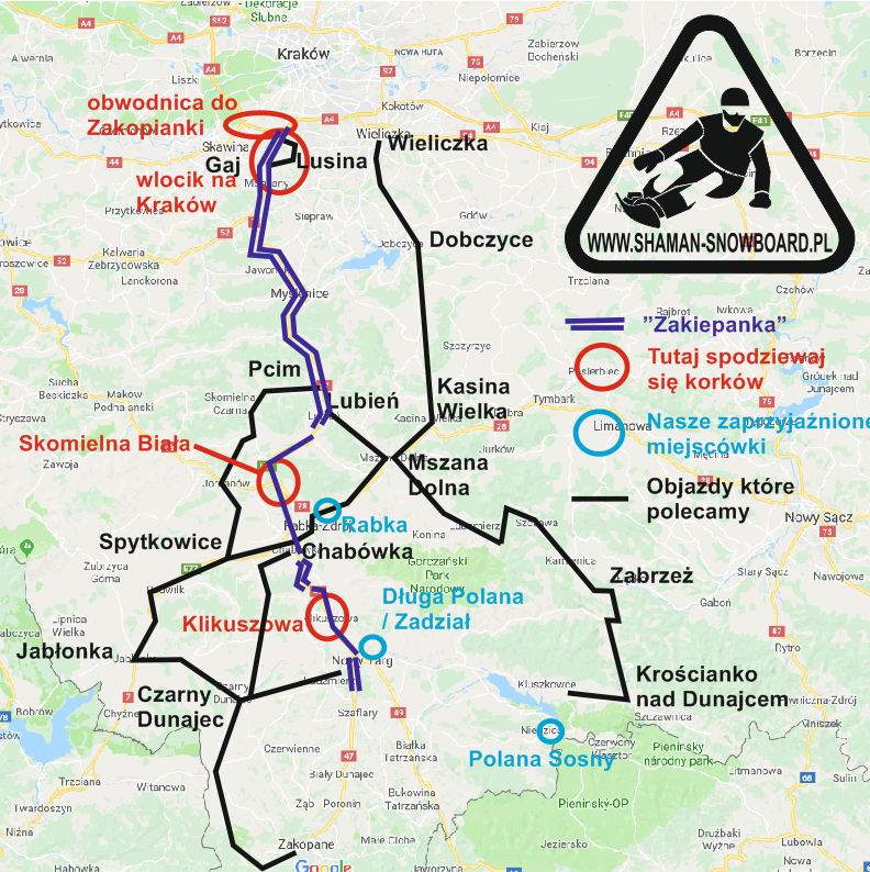 Klikuszowa. Aby ominąć to miejsce, także prawie zawsze stojące, jadą w góry w Rabce uciekamy na Chyżne, trzymając się krajowej "7". Czasem do Skomielnej stoi się aż od Lubnia, wtedy jeszcze na ekspresówce w Pcimiu warto uciec na Jordanów i dalej na Spytkowice.